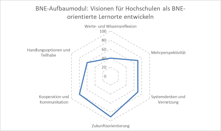 Im BNE-Aufbaumodul werden Konzepte und Inhalte aus dem BNE-Basismodul aufgegriffen und vertieft. Ziel ist die Unterstützung bei der Implementierung in die eigene Lehre sowie bei der Implementierung von BNE als Whole Institution Approach.